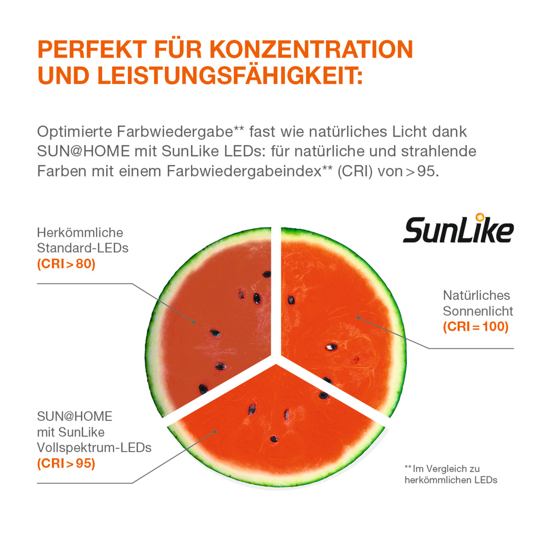 - Die innovativen SunLike Vollspektrum-LEDs der SUN@HOME-Produkte bieten ein breiteres Farbspektrum als herkömmliche LEDs: von gemütlichem Kaminlicht bis zu anregendem Tageslicht (2 200 – 5 000 Kelvin) und dabei mit natürlichen und strahlenden Farben mit einem Farbwiedergabeindex (CRI) von >95.